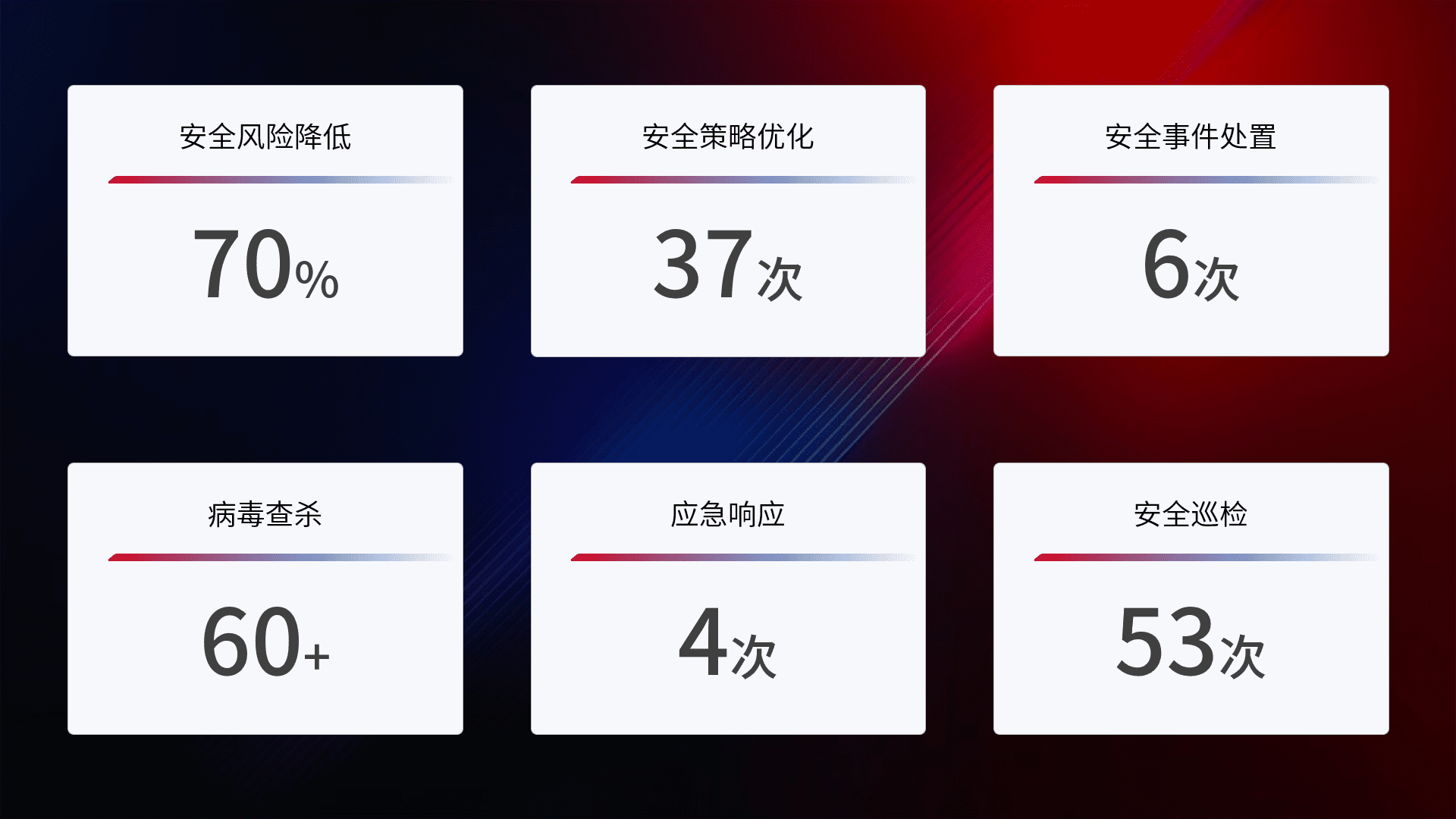 提供全面的安全事件报告体系,,包括处置报告、、周报、、季度和年度总结,,,结合持续监控,,,帮助客户深入了解网络安全状况。。